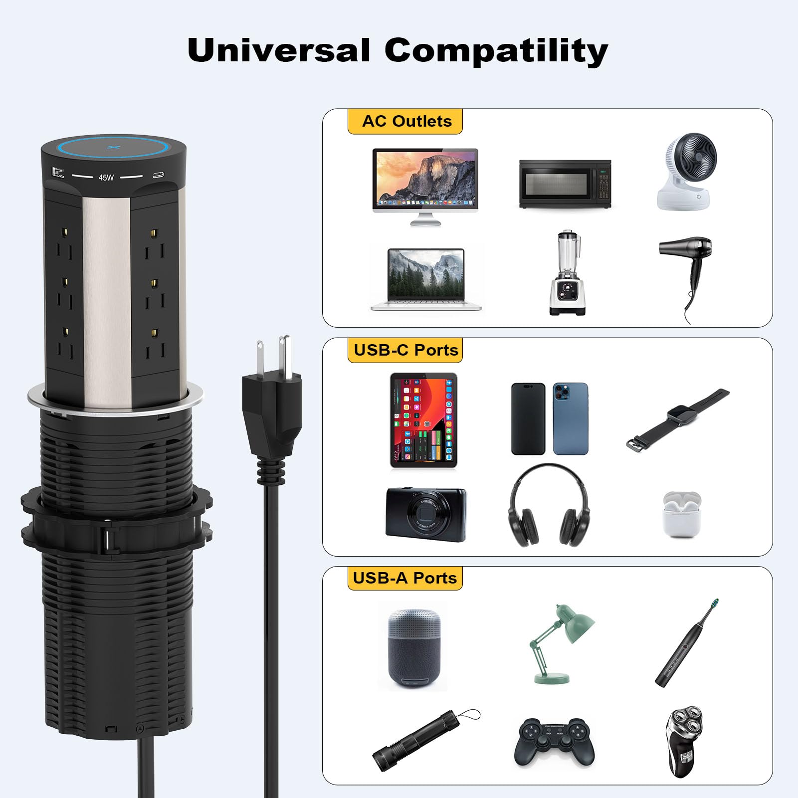 ¡¾Widely Use¡¿ Pop-Up Power Outlet with Wireless Charger. It is a well-made, versatile, and stylish power outlet that It's perfect for desk grommet, countertops, conference, kitchen island.If you choosen it, now You can plug in lights, Macbook, printer, laptop, ipad. You can also just lay your phone on top to charge.There is even places left for friends to use if needed. Also, it has 75W USB charging ports (4 USB) for other electronic devices.