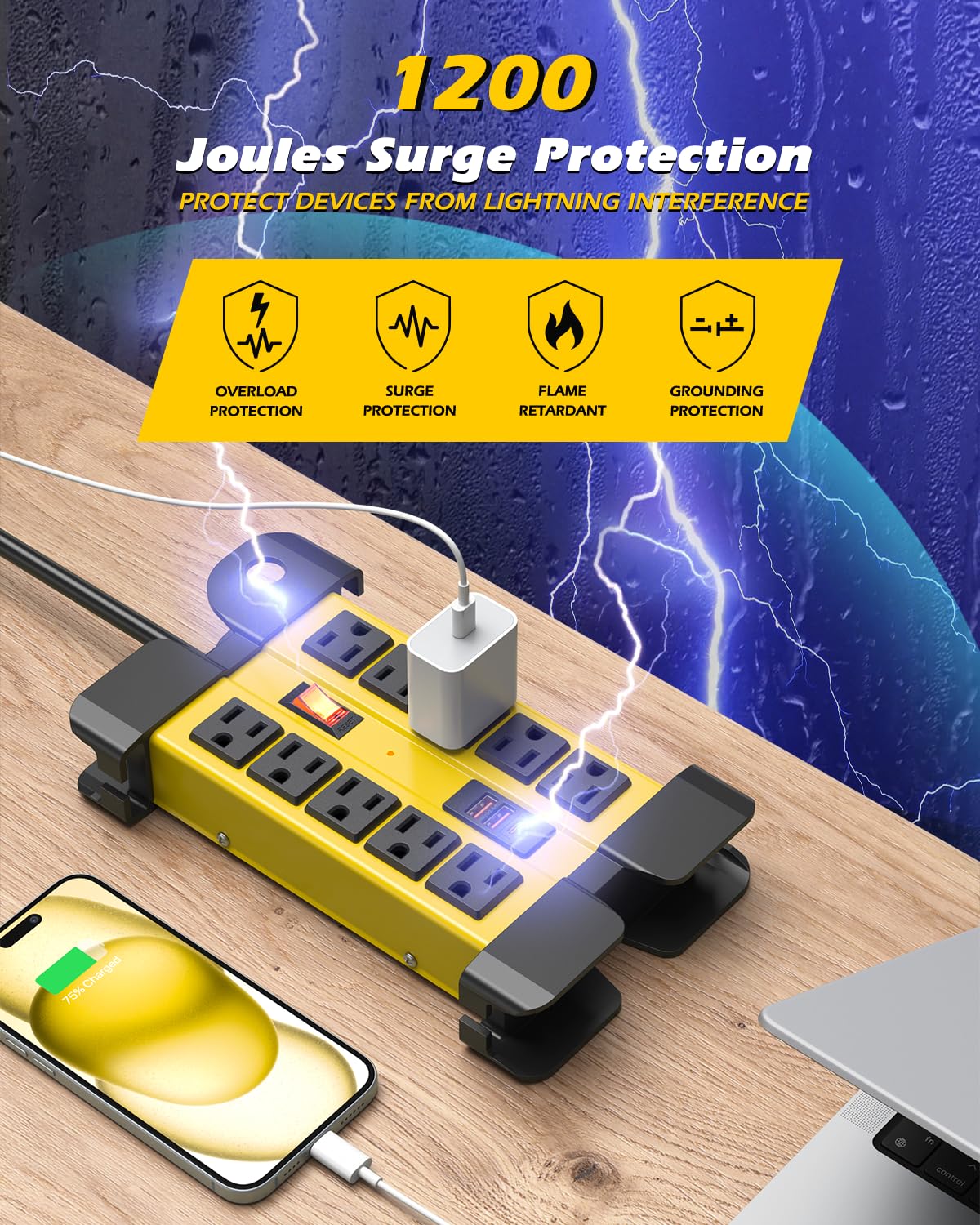 - 6 Point Real Time Protection - fire-proof construction of the industrial power strip ensure no safety hazards in daily use. 1200 Joules superior surge protections protect devices from lightning interference, overload circuit breaker and grounded protection, heavy duty surge protector power strip charge your devices with peace of mind.