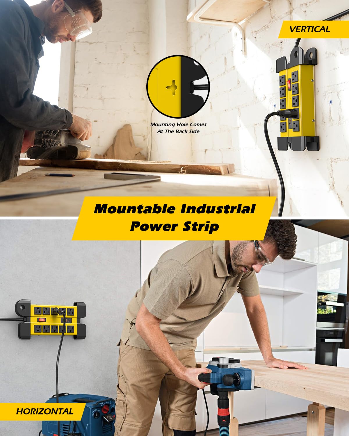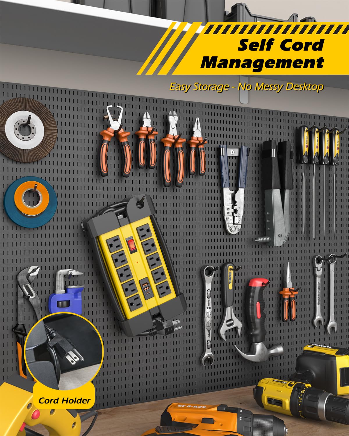 - Wall Mount & Self Cord Management - Wire sorting for retractable extension cord, unique cord holder prevent messy desktop. wrap around 6ft cord into the slot. Easy to carry and organize. Garage power strip wall mount supports both horizontal and vertical installation, mountable on walls, tool racks, table side or any corner you want to hang on.